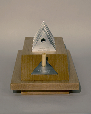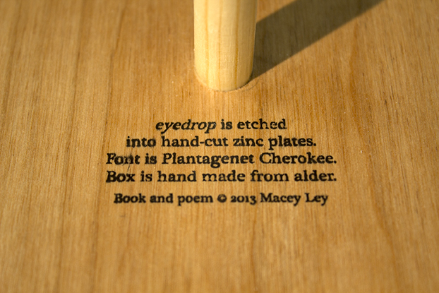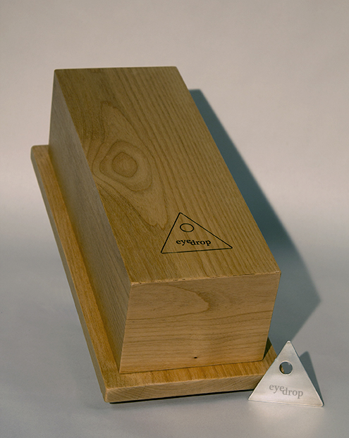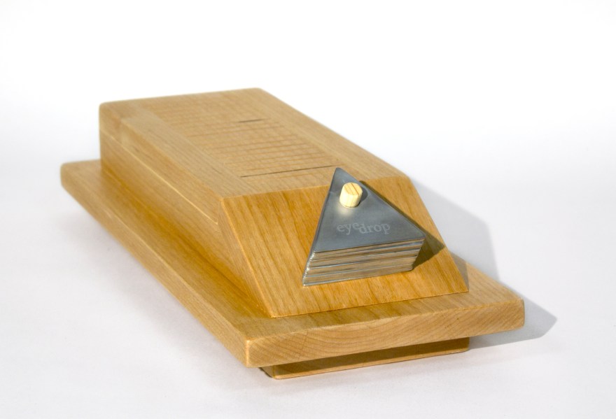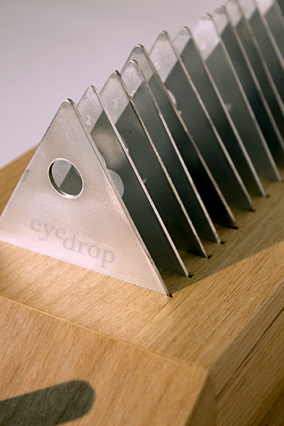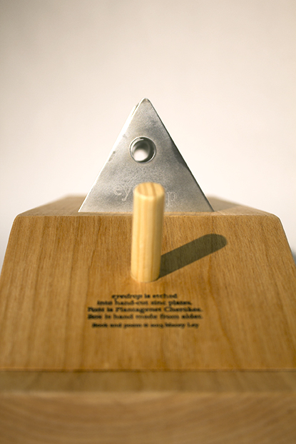 eyedrop is an interactive artist book with triangular zinc pages that take the reader through a scenario based on intuition. The pages start in a stack hooked on the post and by the time each page is set in place on the top of the book, the reader will be able to look through the series of holes to understand the obviousness of hindsight.