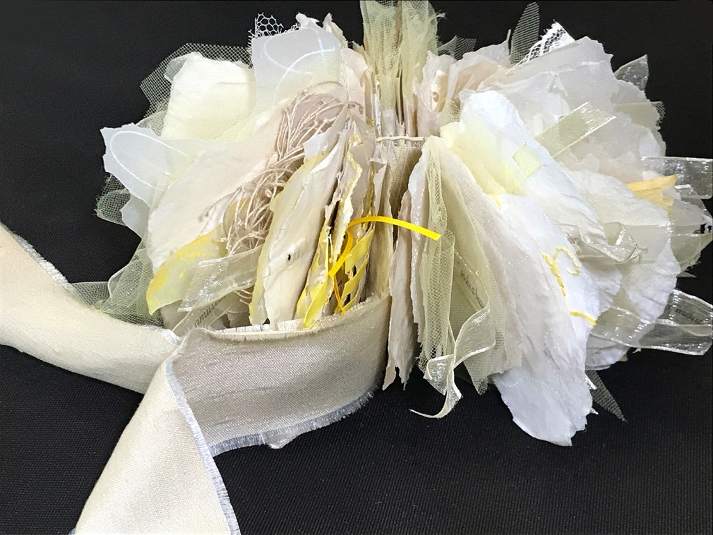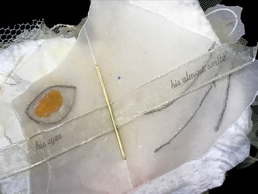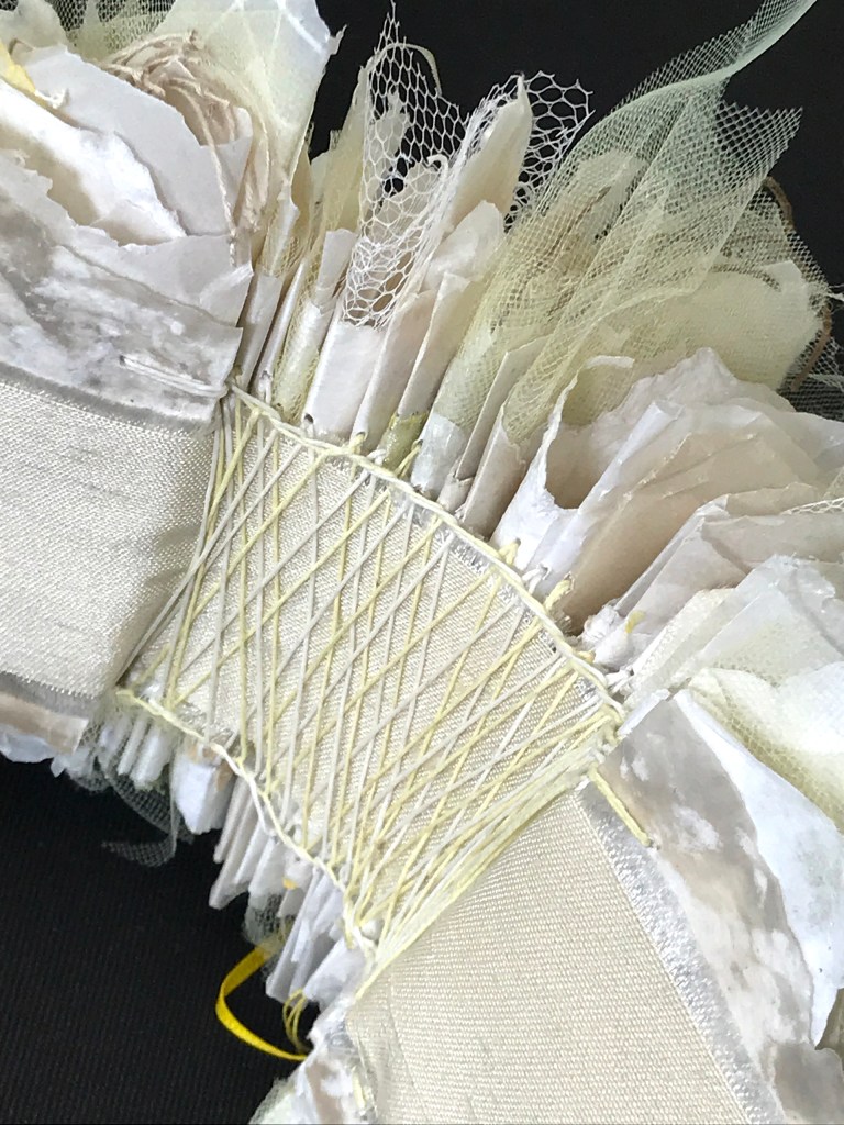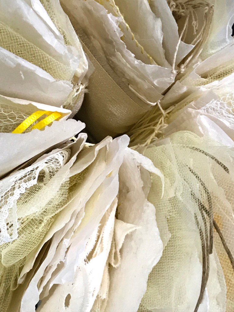 handmade paper, watercolor, found objects, cotton, hemp, fabric, lace, satin ribbon, thread