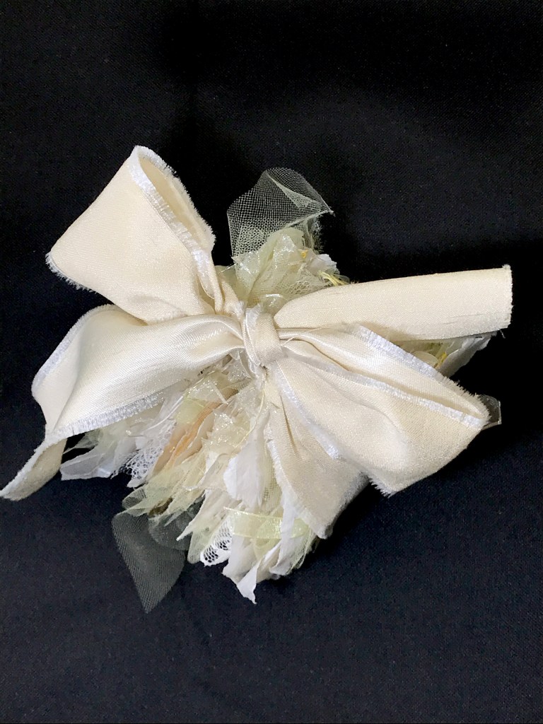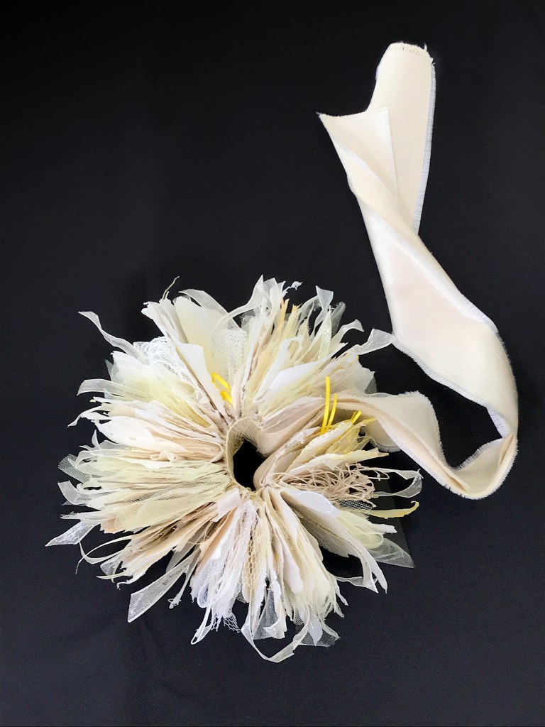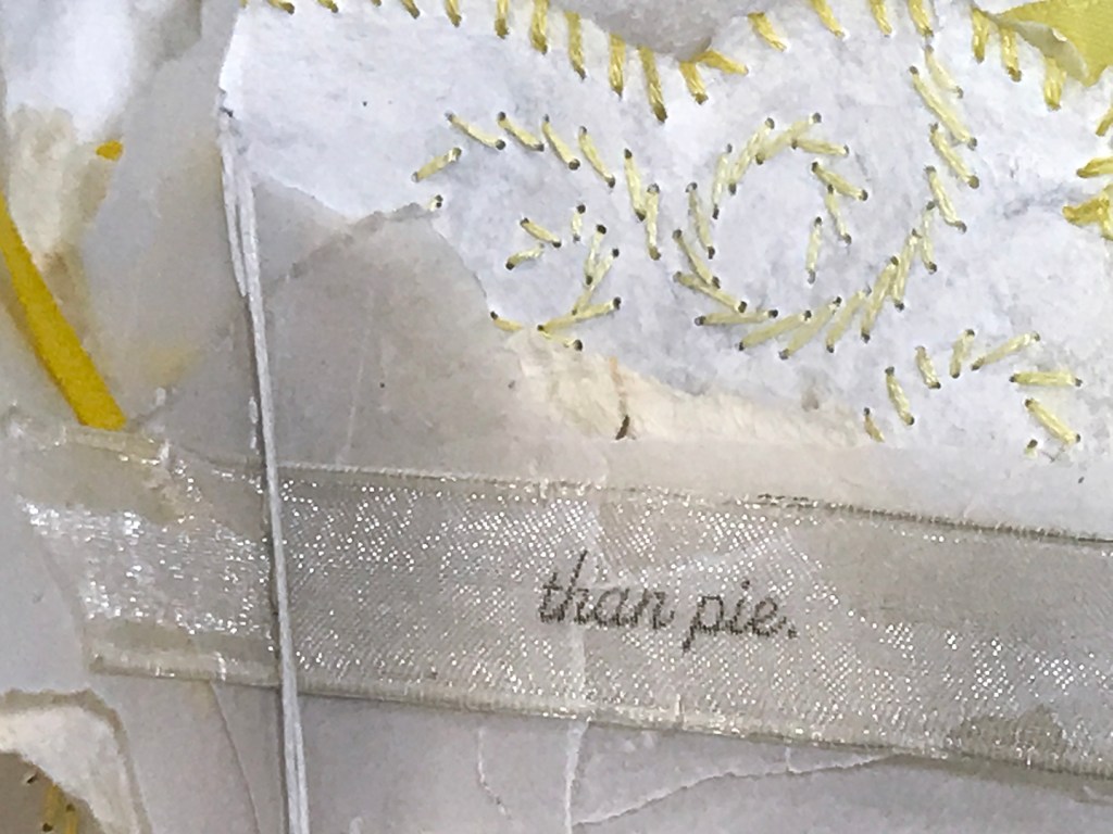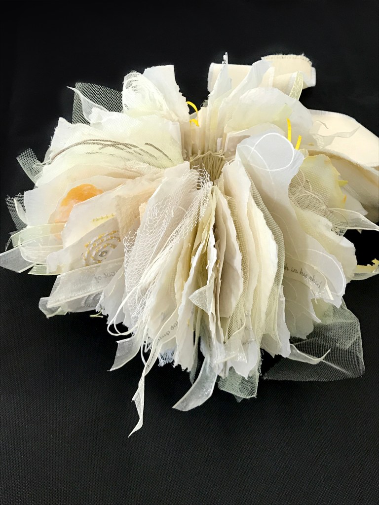 handmade paper, watercolor, found objects, cotton, hemp, fabric, lace, satin ribbon, thread