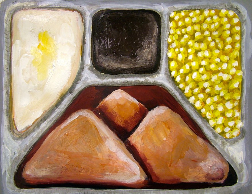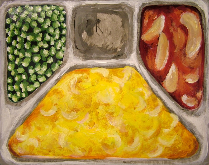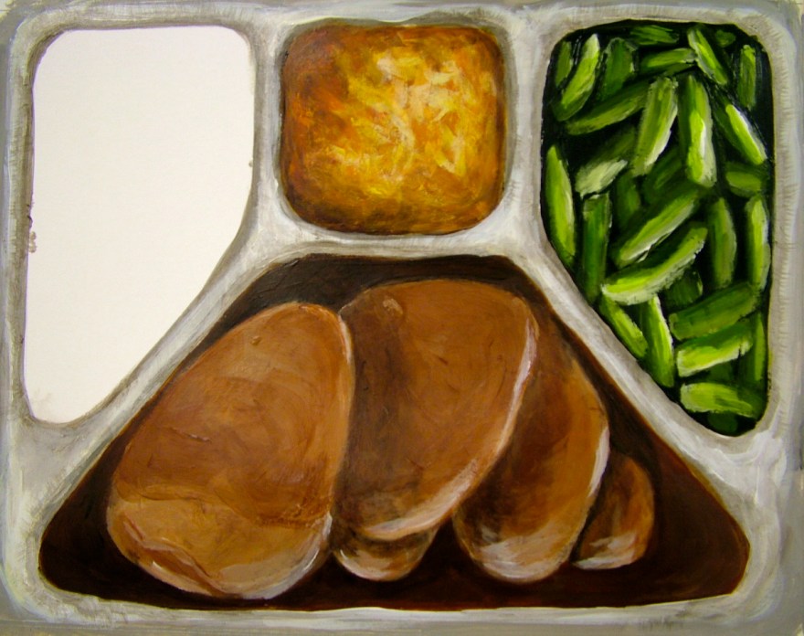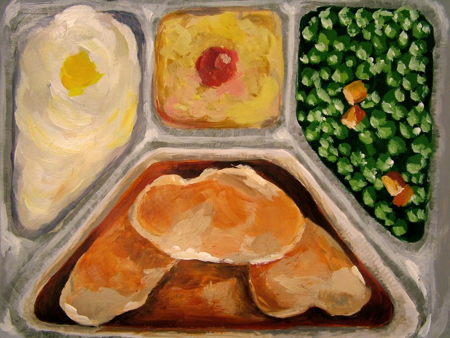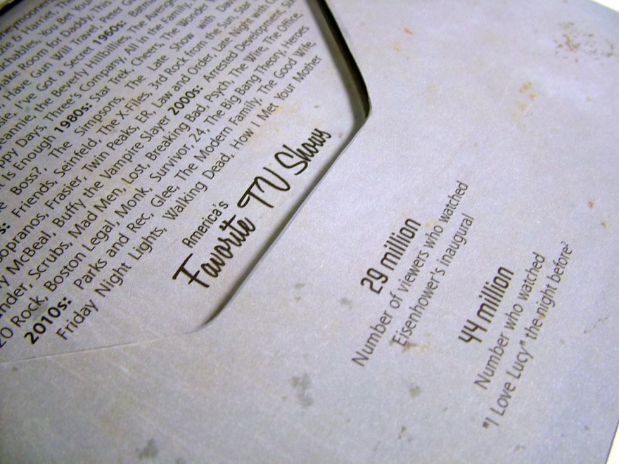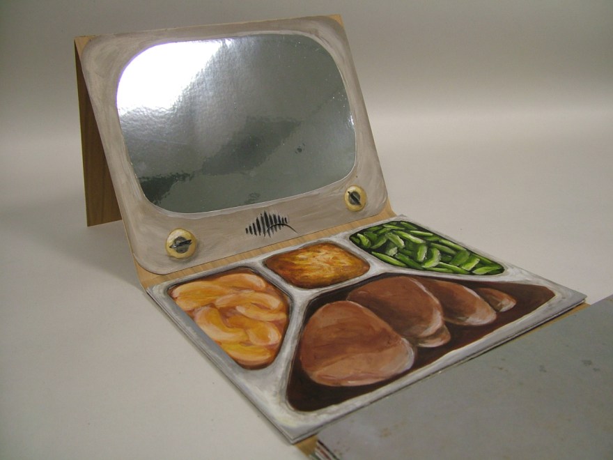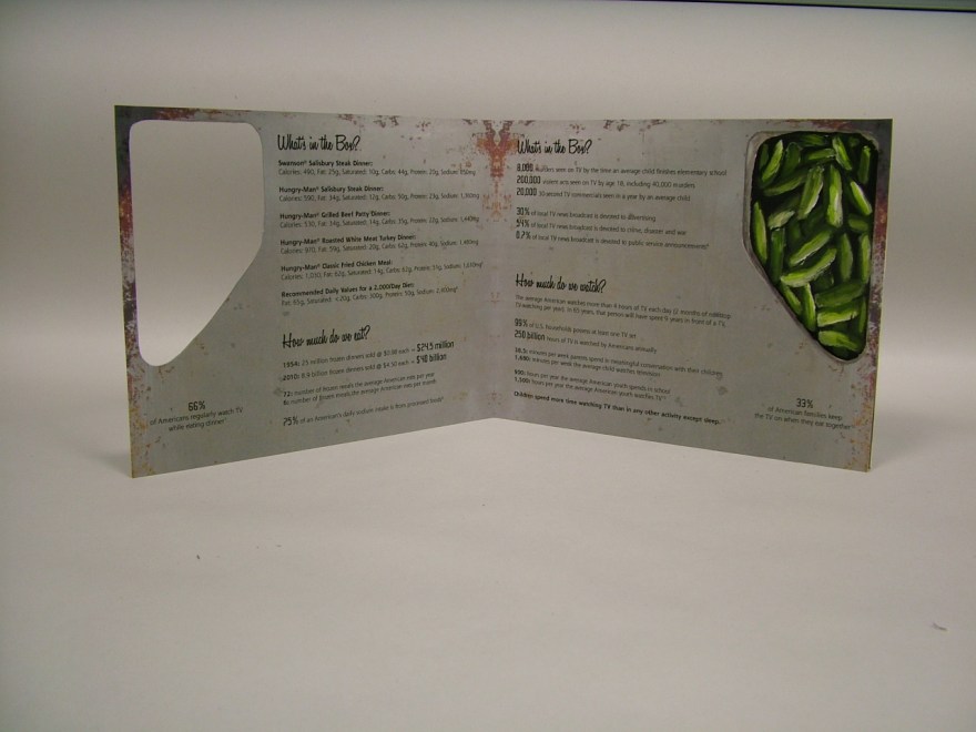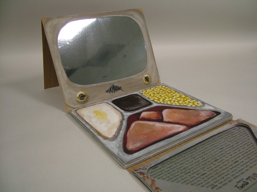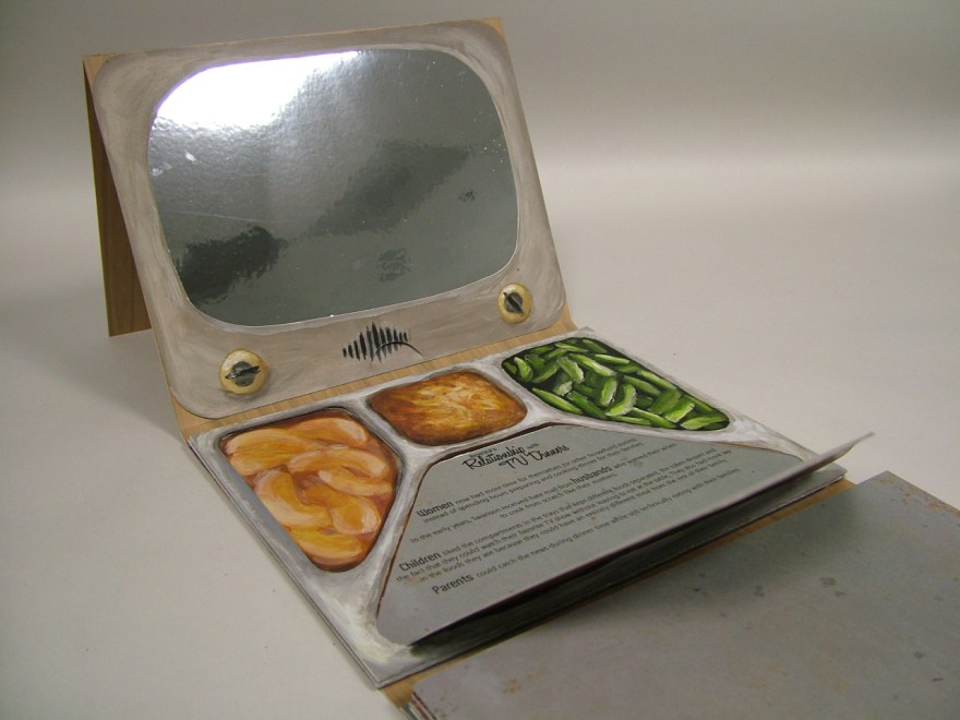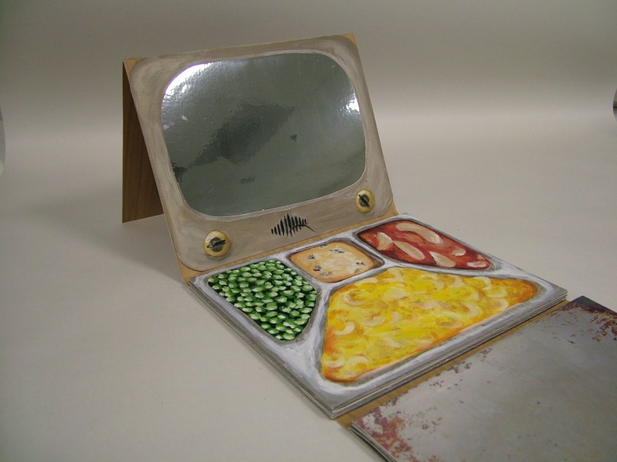 TV Dinner for Zombies is a pop-up style artist book. Through interactive panels, this week of prepared meals reveals data on America’s love affair of eating while watching TV. Originally marketed as something as something that would save time and bring families together, the popularity of TV Dinners signaled the beginning of the demise of the family dinner and a variety of related physical and mental health issues.