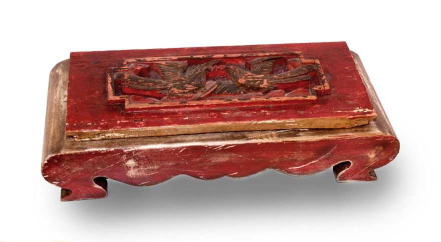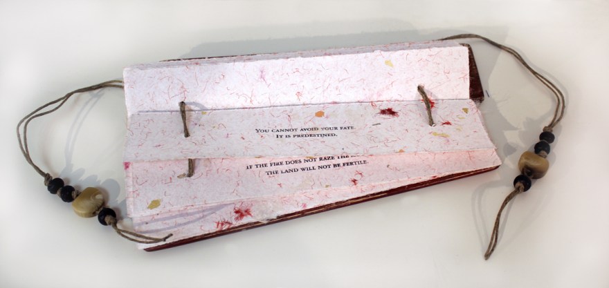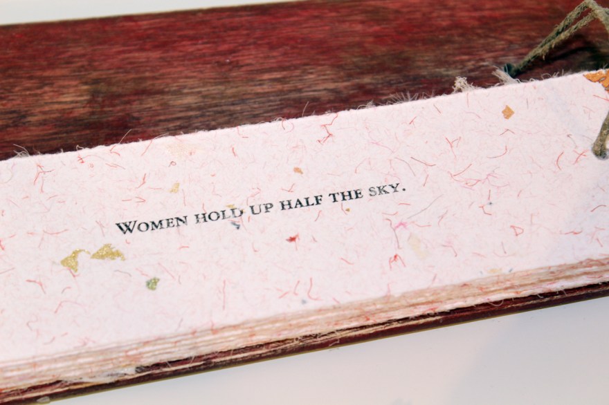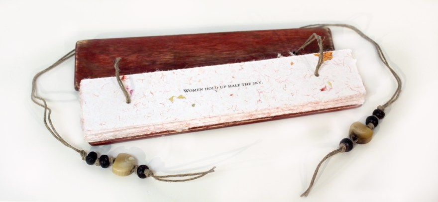Single edition book with ancient Chinese proverbs and advice given to women by women. The paper is handmade with cotton rag, gold leaf and Chinese silk scarves. The book is bound between handmade wooden covers with hemp cord and wooden beads in the tradition of palm leaf binding. The wooden casing is handmade. The box lid is a panel from an old Chinese shutter.